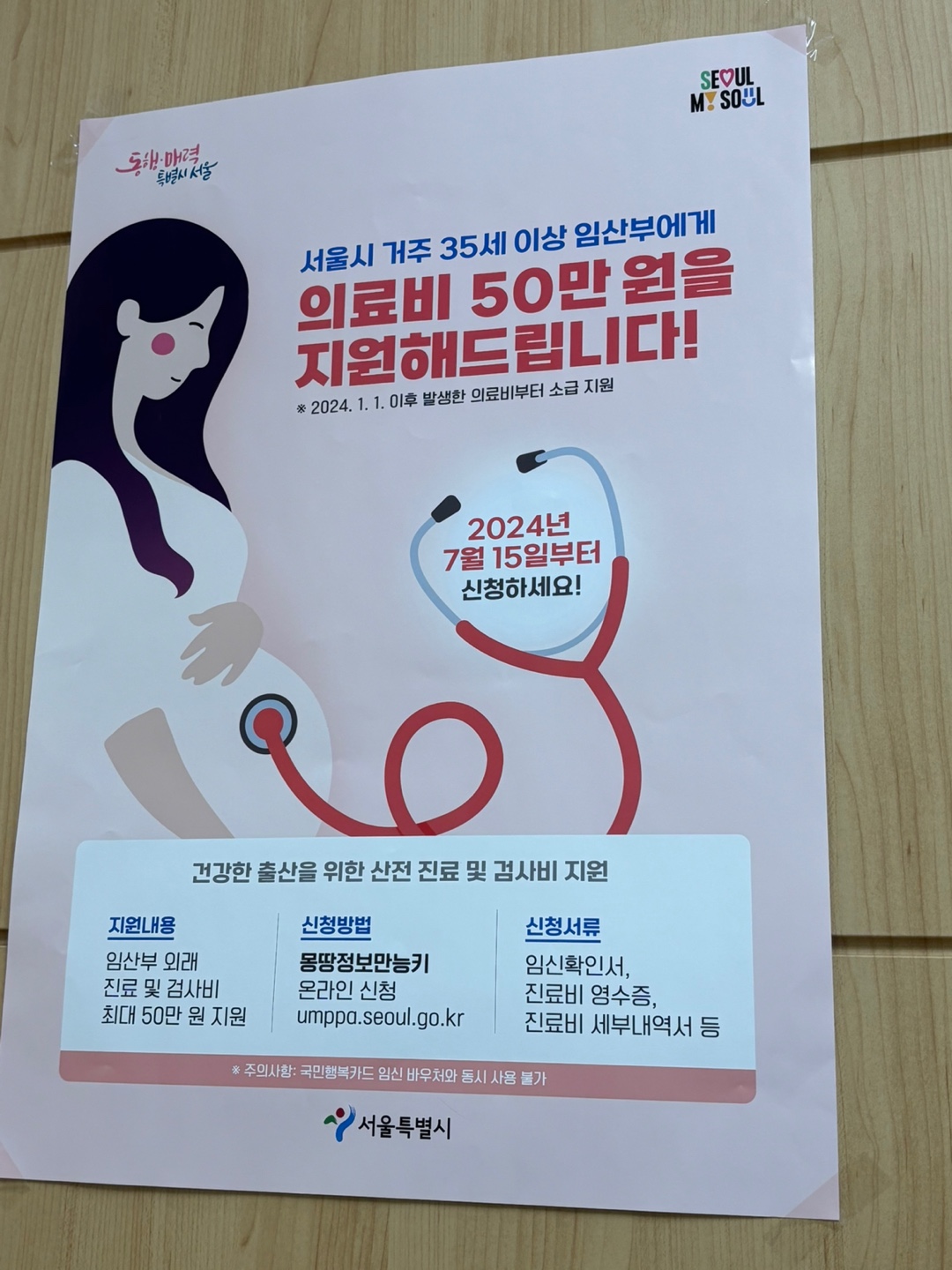 보건소에 상담받고 나오는데 직원분께서 꼭 신청하라면서 알려주신 것입니다. 35세 이상인 임산부에게 50만 원 의료비를 추가로 지원을 받을 수 있다고 합니다. 이 제도는 건강한 출산을 위한 산전 진료와 검사비 지원을 위해 서울시에서 진행하는 것입니다. 바우처카드랑 다른 거니 꼭 알아보셔야 합니다. 한 번에 신청이 가능하니 영수증을 꼭 모아서 50만 원 정도의 금액을 한 번에 신청해야 한다고 합니다. 따로따로 신청 안됩니다.